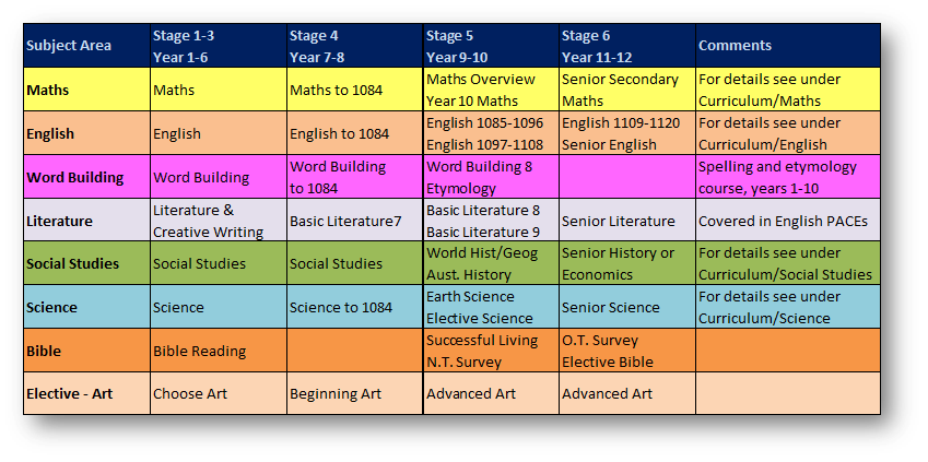 The following table shows an example of using the A.C.E. and SCEE resources to form a study pathway for a student from pre-primary through to graduation, obtaining an AEM A.C.E. Certificate. Subject areas on a pathway include Christian Studies, English, Literature, Maths, Science, Social Studies (History/Geography) and Word Building. Please see our Certificate Pathway page for information on graduate certificate options.