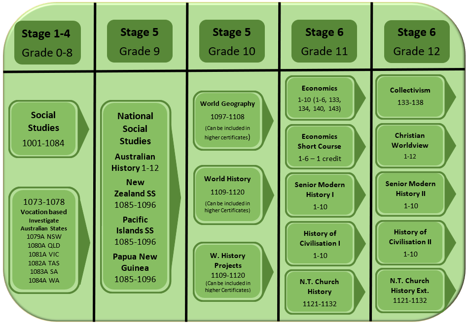 Social Studies PACEs are sequential through to Year8/9; after this, students choose between World History and World Geography, followed by Australian History. Senior Secondary has a broad range of subjects. The following table is a guide. Contact us for more detailed assistance.
